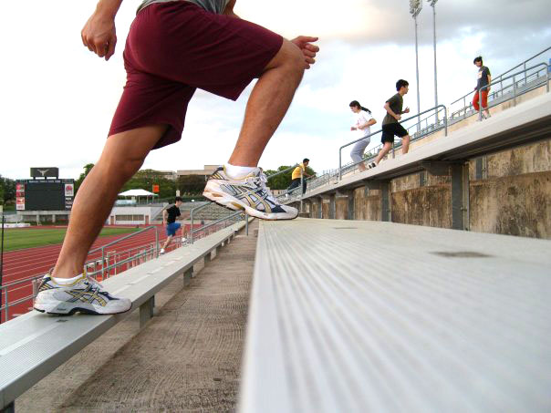 Climb the stairs/bleachers as fast as you can using every step. Walk down and repeat for 45 seconds. Rest 20 seconds and repeat but skip a step/bleacher this time.